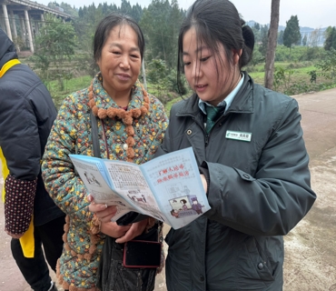 邮储银行资阳市分行工作人员(右)向农村居民宣传金融知识。机构/供图
